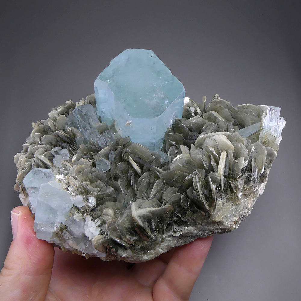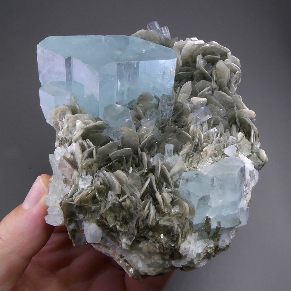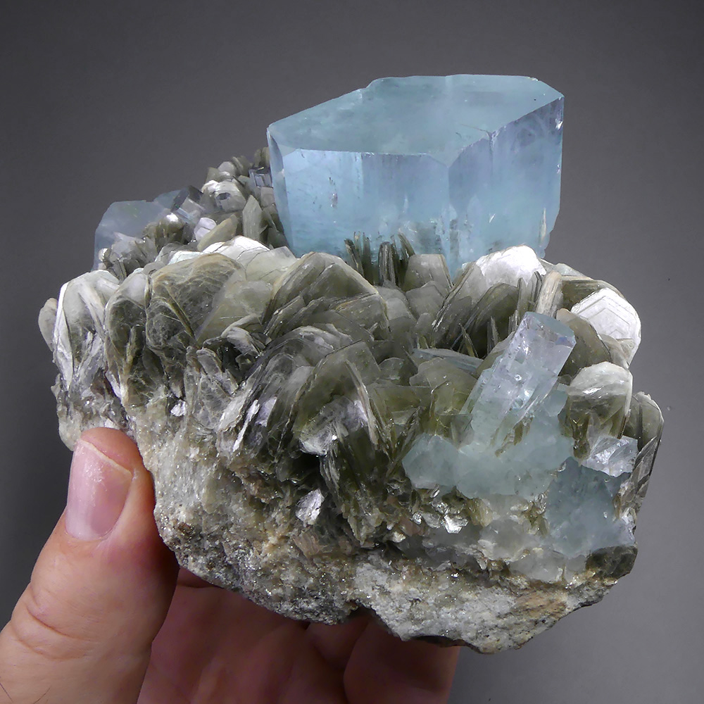 Aquamarine is one of the most beloved and sought-after minerals by collectors around the world. This is an aesthetic, well-balanced large combination specimen composed of a large single Aquamarine crystal aesthetically positioned on a bed of pearlescent Muscovite blades. The main crystal is surrounded by smaller Aquamarine crystals, all with a gem-like to translucent appearance and a fine icy blue to colorless hue highlighted by smooth and shiny surfaces. The main crystal, standing 3.5 cm tall, has the particularity of being a hexagon symmetrically flattened. Considering the large production of Aquamarines from Pakistan and the considerably high prices, we can confidently say that this piece offers an excellent quality-to-price ratio and good aesthetics.
