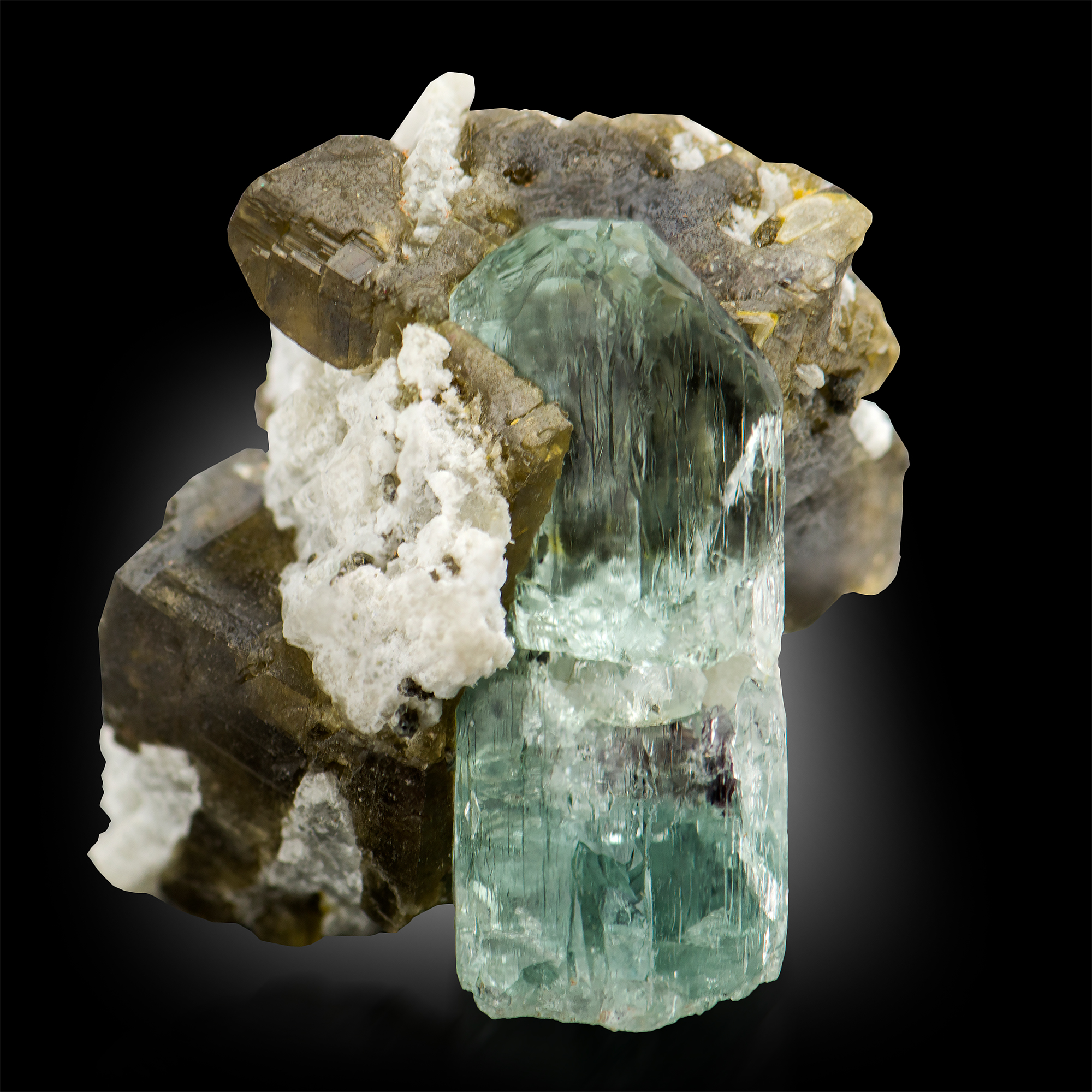 Absolutely unusual association composed by a single brilliant Aquamarine crystal, partially etched in the middle, embedded in brown siderite crystals with shiny surfaces. Specimen dedicated to Aquamarina lovers. Custom base included.