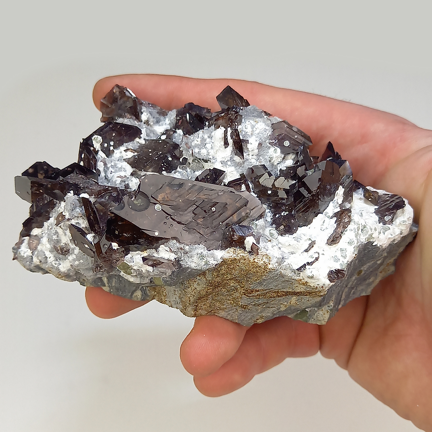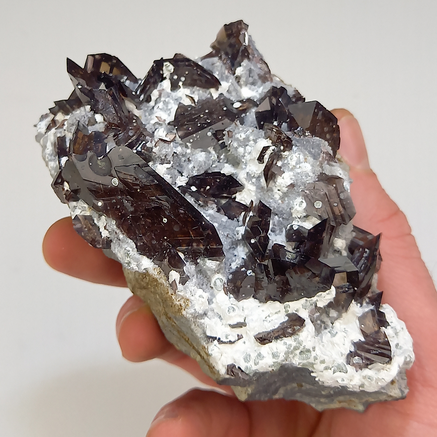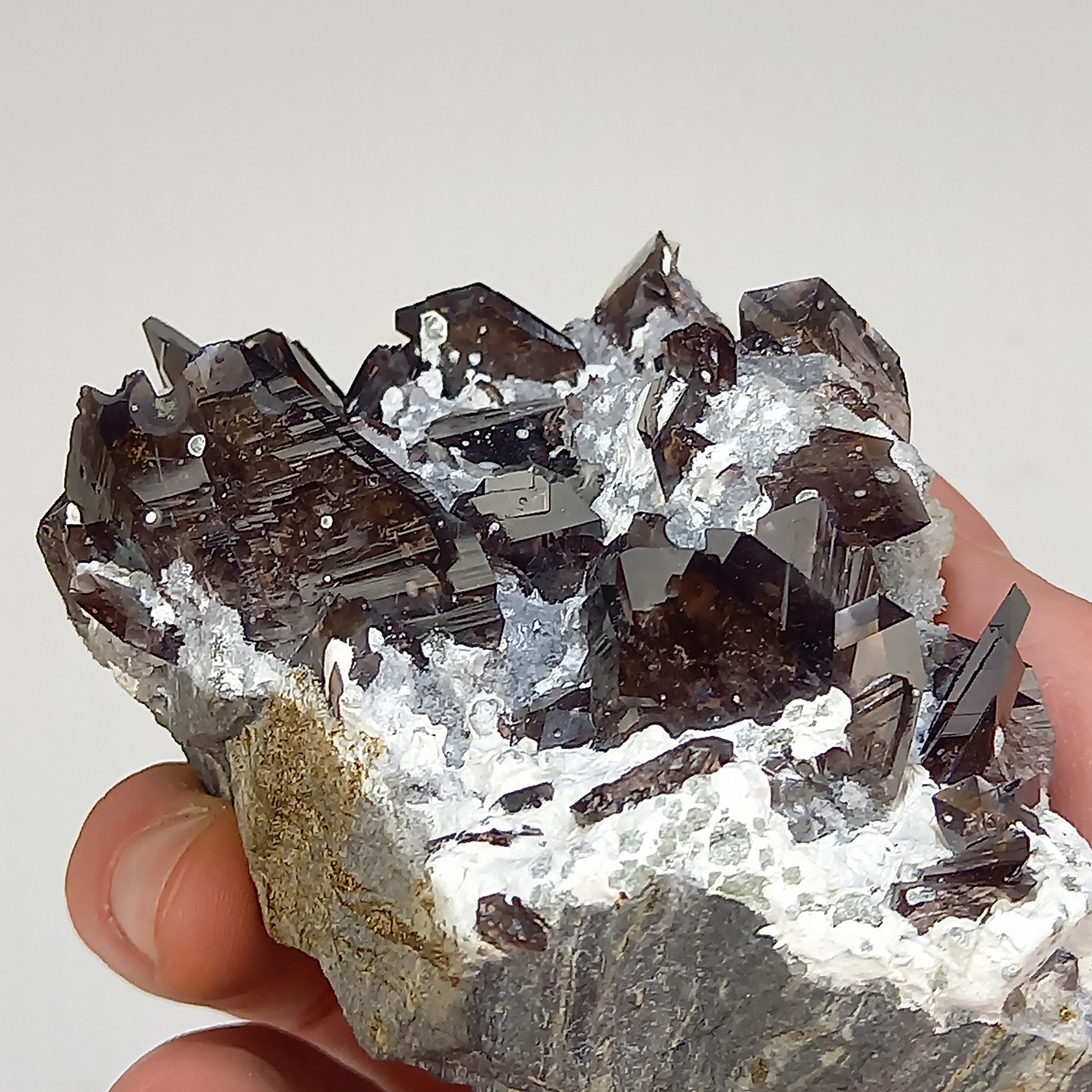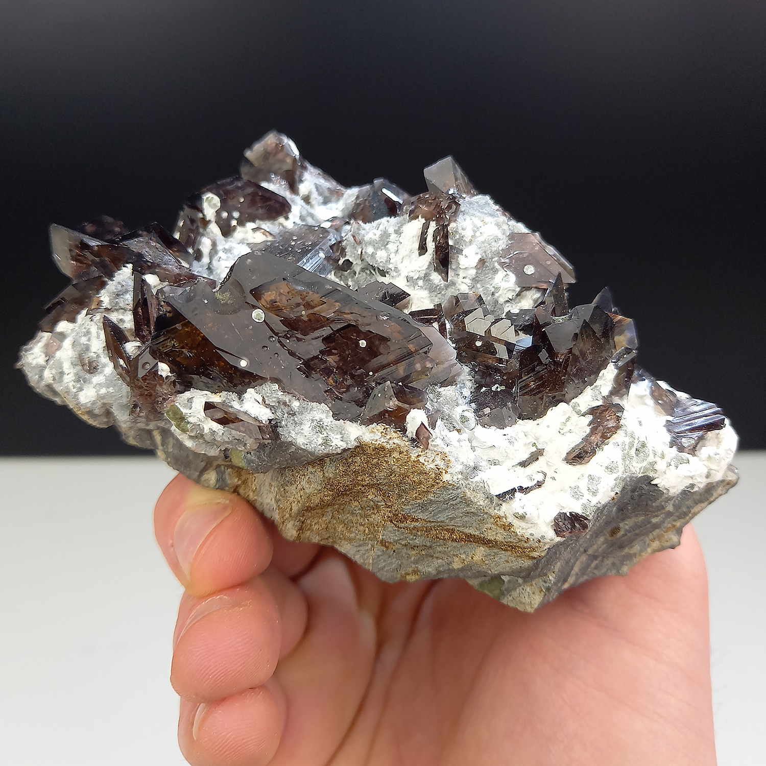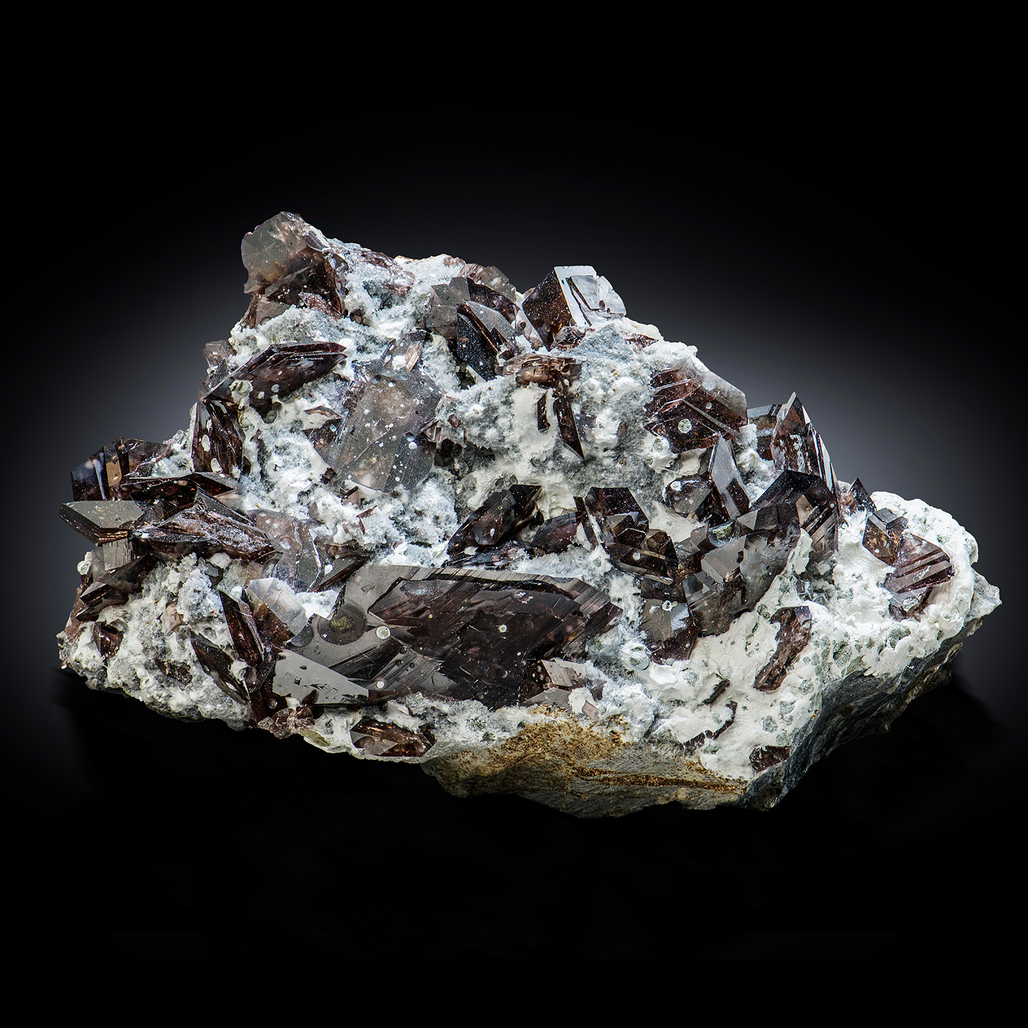 Axinite crystals from Puiva Mount, Saranpaul, Berezovo district, Khanty-Mansi Autonomous Okrug, Russia – sharp, highly lustrous, gemmy to translucent, brown Axinite crystals elegantly emerging from a white aggregate of fibrous Amphibole supergroup (Byssolite/Tremolite); in the Ural mountains, with subarctic climate, the Puiva mount area is a remote locale with alpine-type deposit; many specimens was found between 1980s 1990s but only later did they reach world markets; this place is a reference point for every Axinite collectors but today is very difficult to obtain specimens showing a high quality level like this, here for sale – overall size 11x8x5 cm. – main crystal 4x2x1 cm.