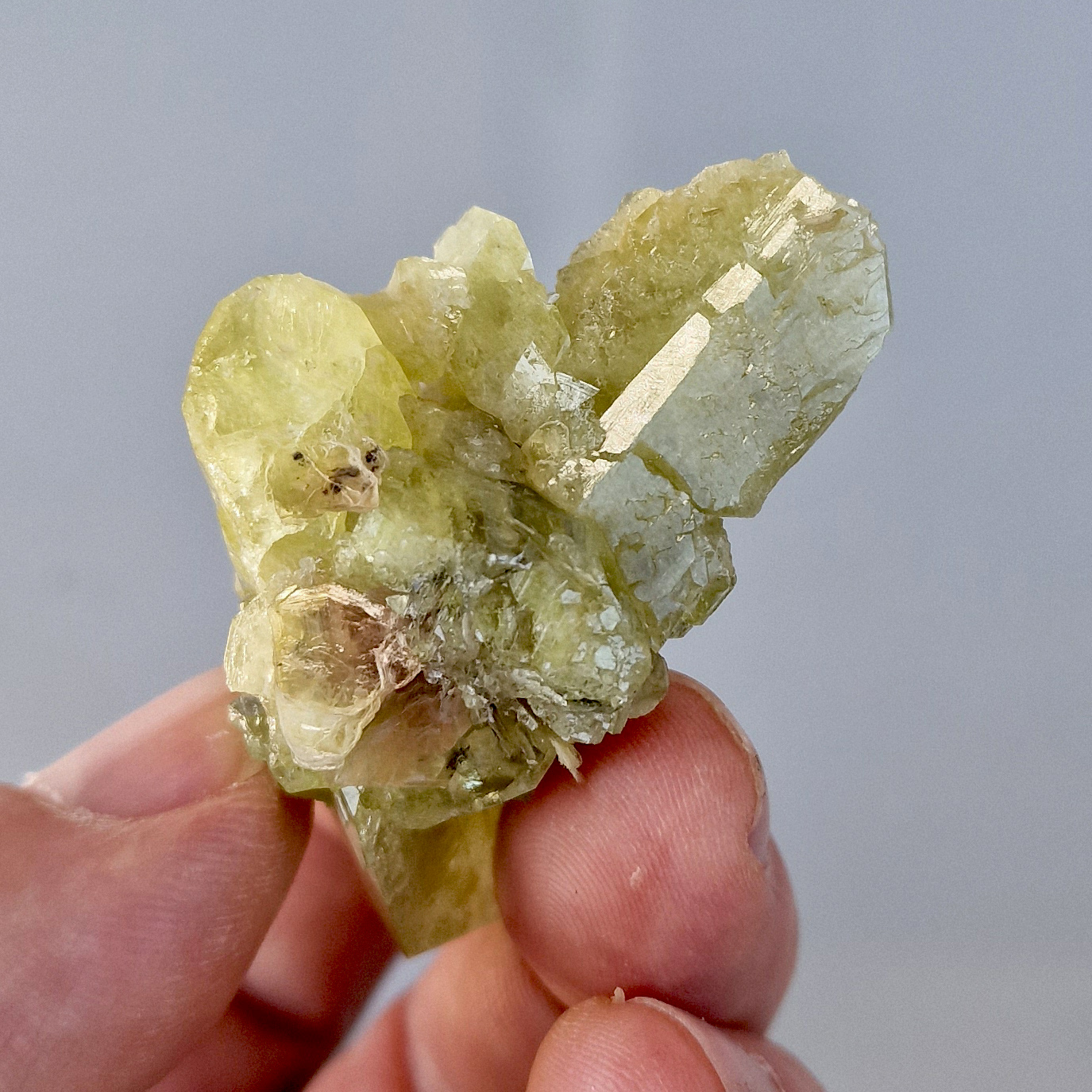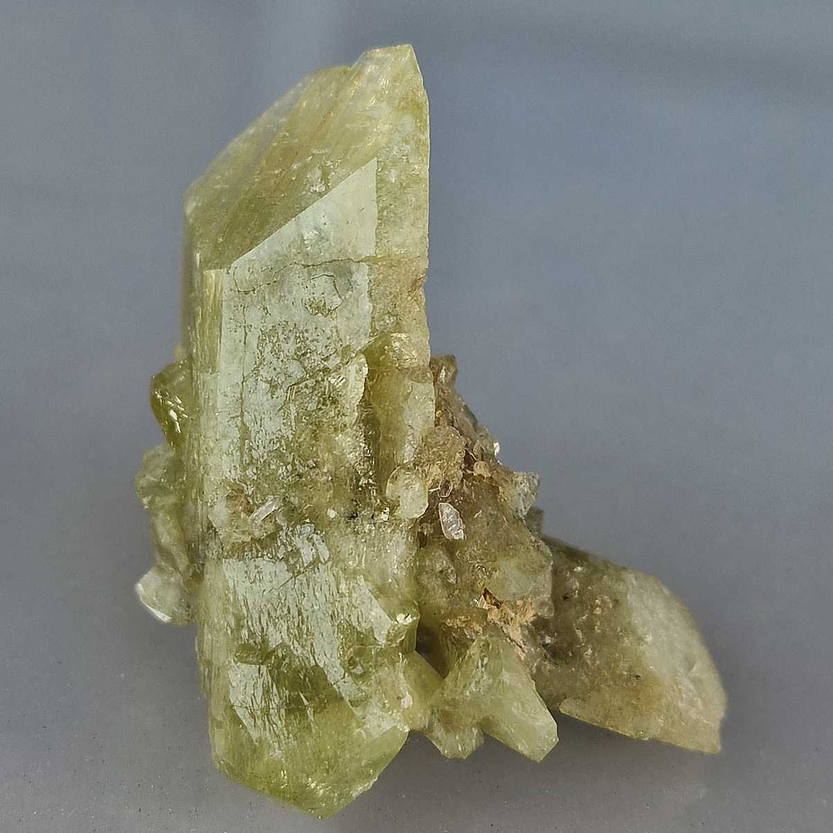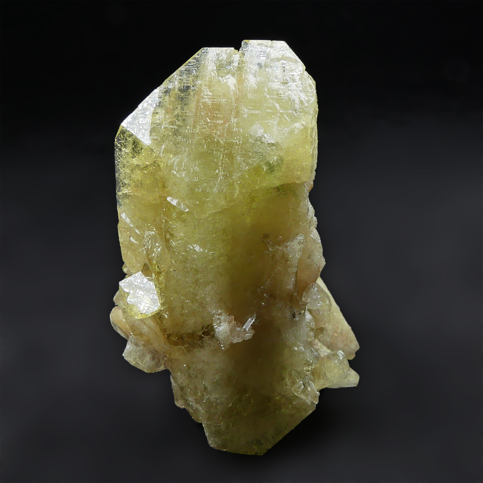Lovely cluster of vitreous Brazilianite with in evidence a bi-terminated crystal. Brazilianite, whose name derives from its country of origin, Brazil, is a typically yellow-green phosphate and one of the most sought after minerals by many collectors.