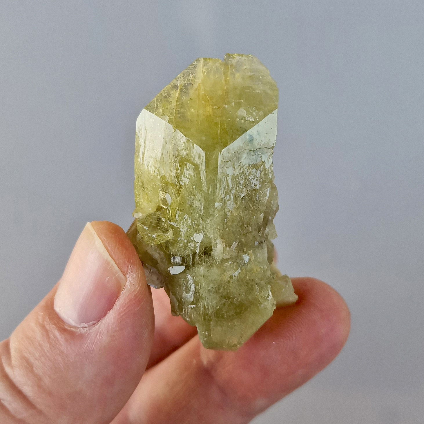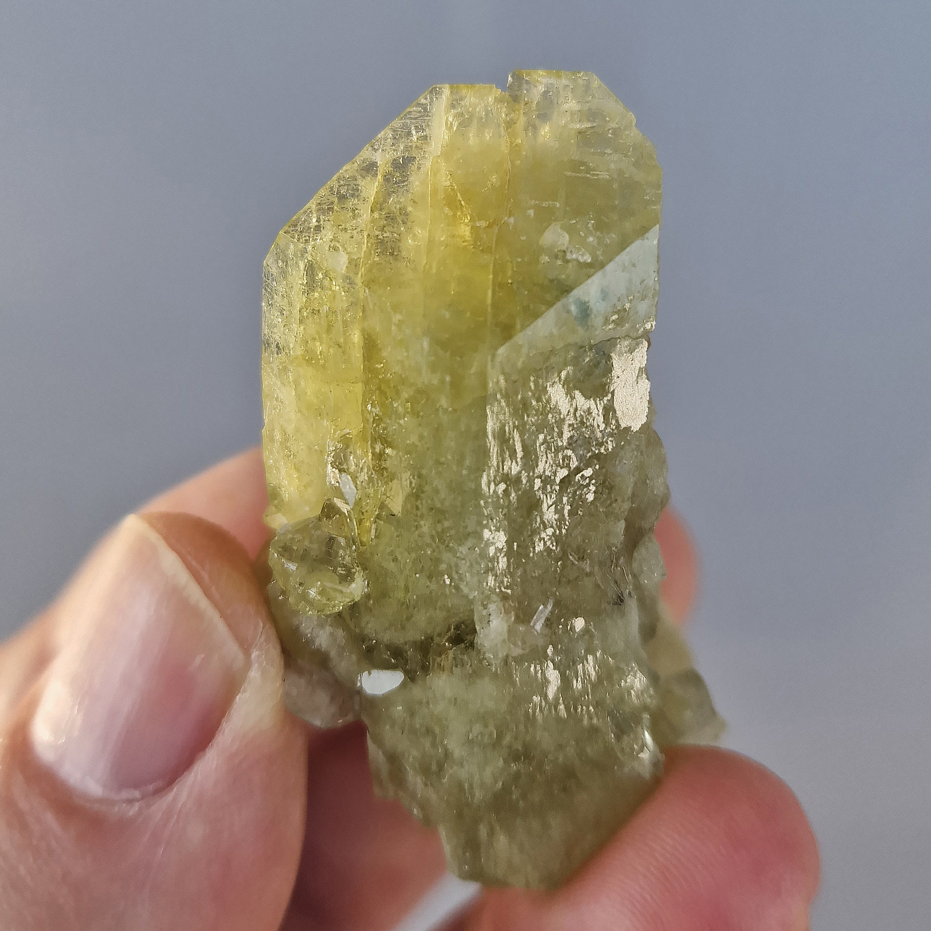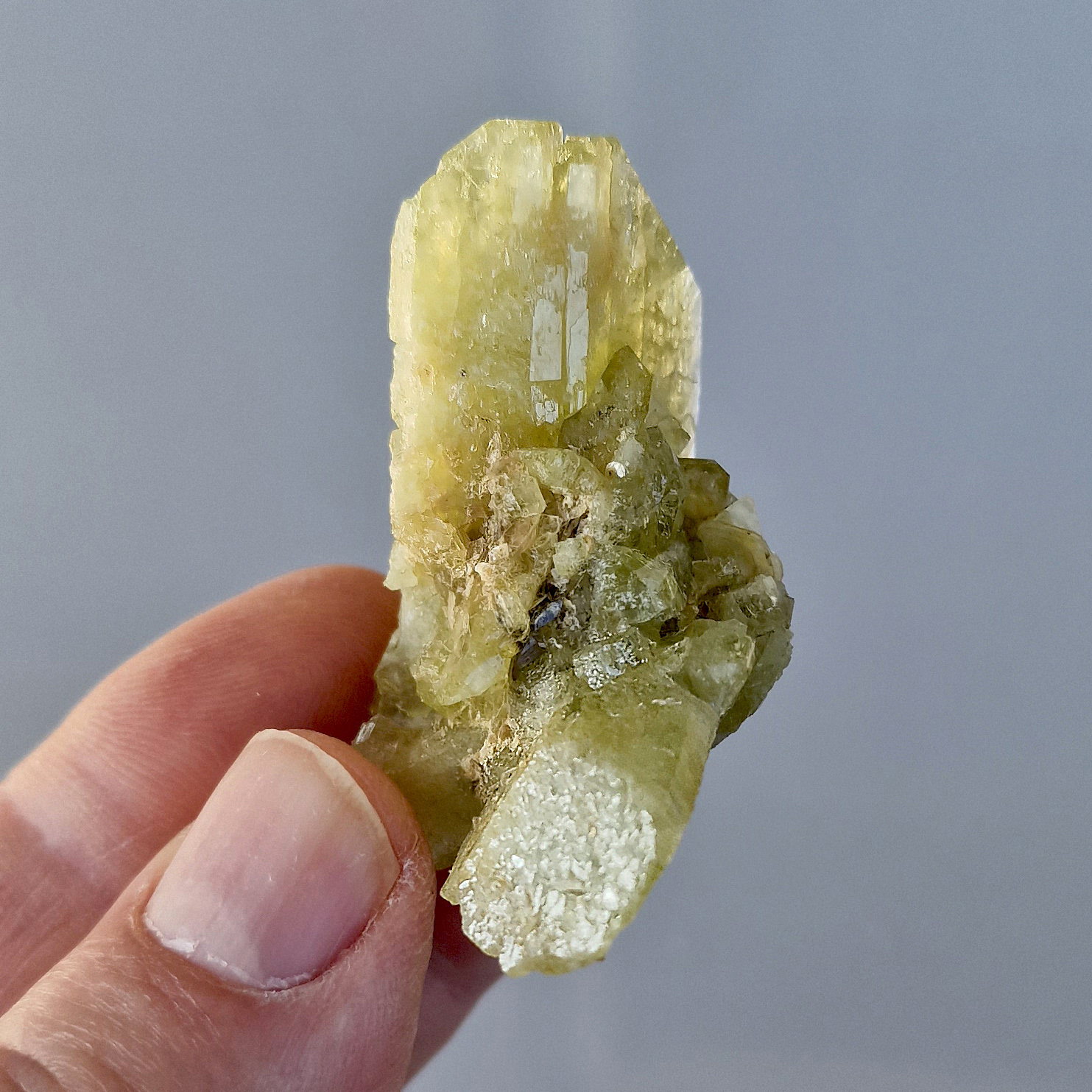 Lovely cluster of vitreous Brazilianite with in evidence a bi-terminated crystal. Brazilianite, whose name derives from its country of origin, Brazil, is a typically yellow-green phosphate and one of the most sought after minerals by many collectors.
