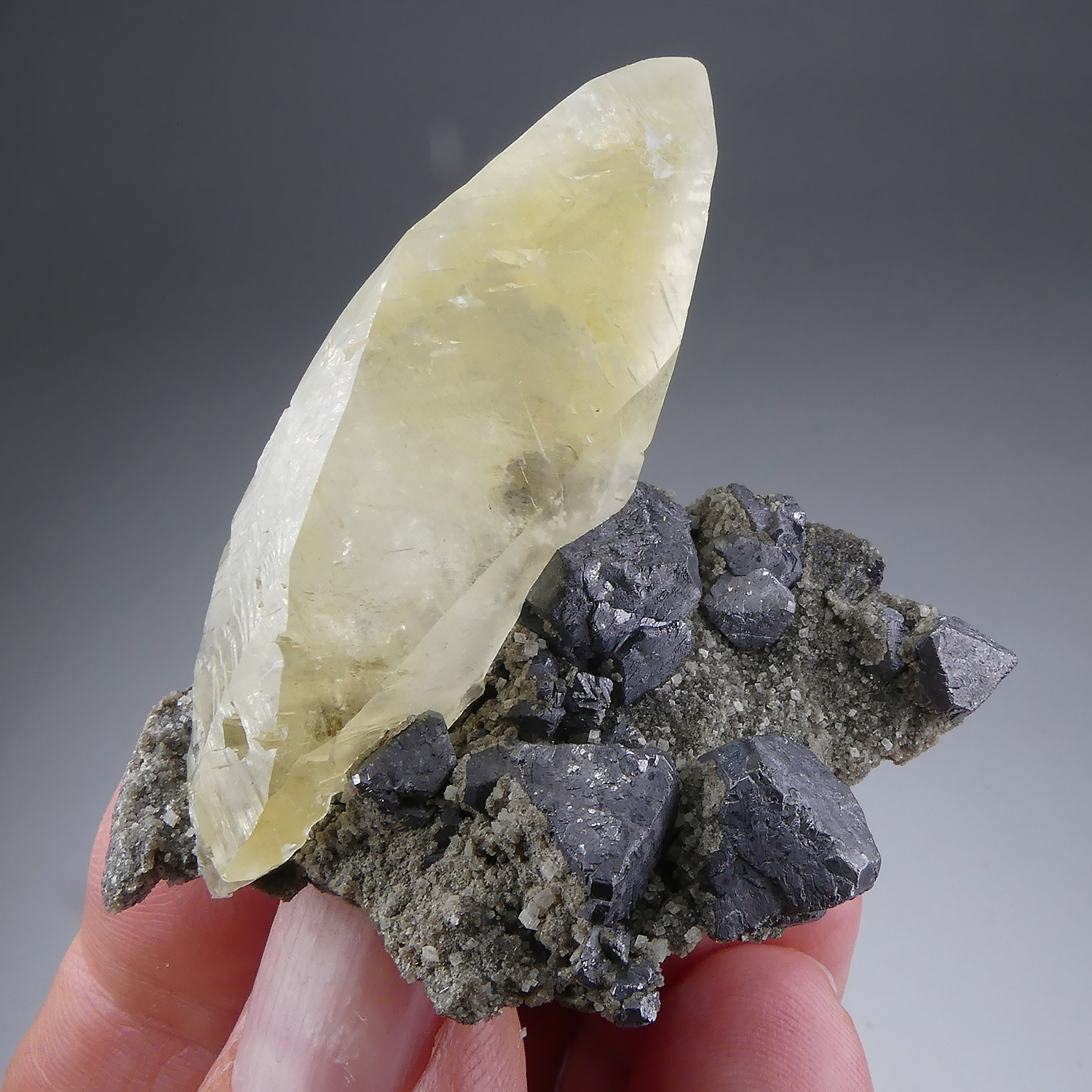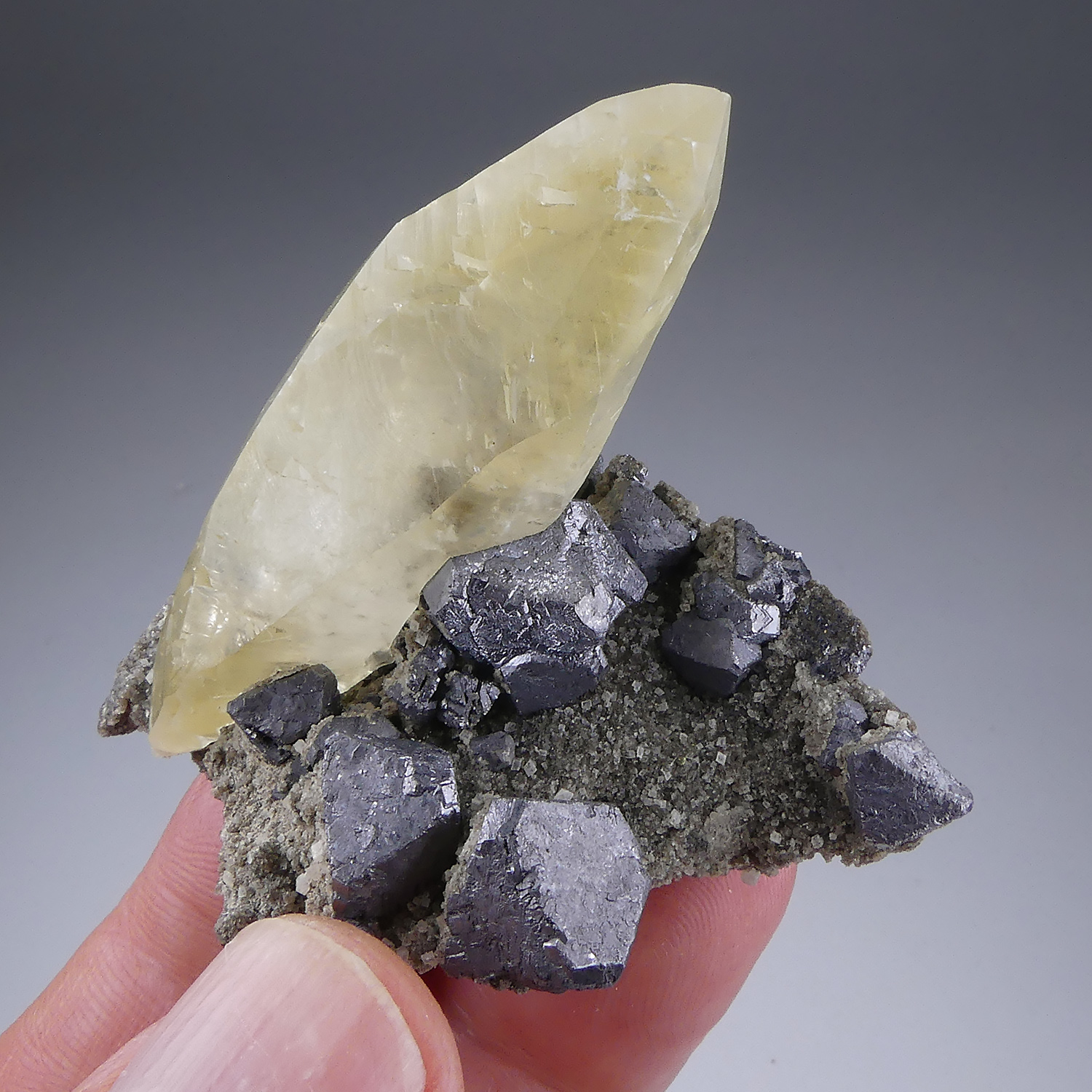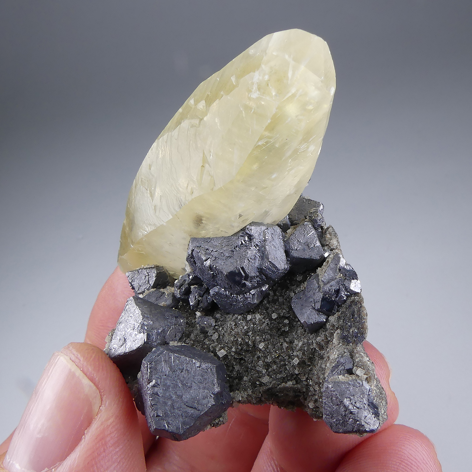 Calcite and Galena from Joplin Field, Jasper Co., Missouri, USA – very nice specimen of double terminated Calcite crystal with transparent to translucent aspect and yellow color, perfectly perched on a matrix composed by octohedral galena crystals with greysch metallic luster – overall size 5,7×4,2×3 cm. – Calcite 5,2×1,7 cm.