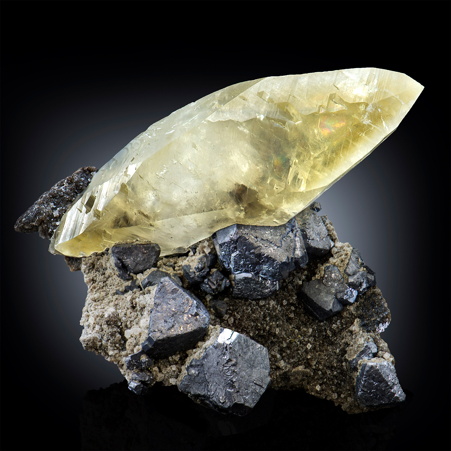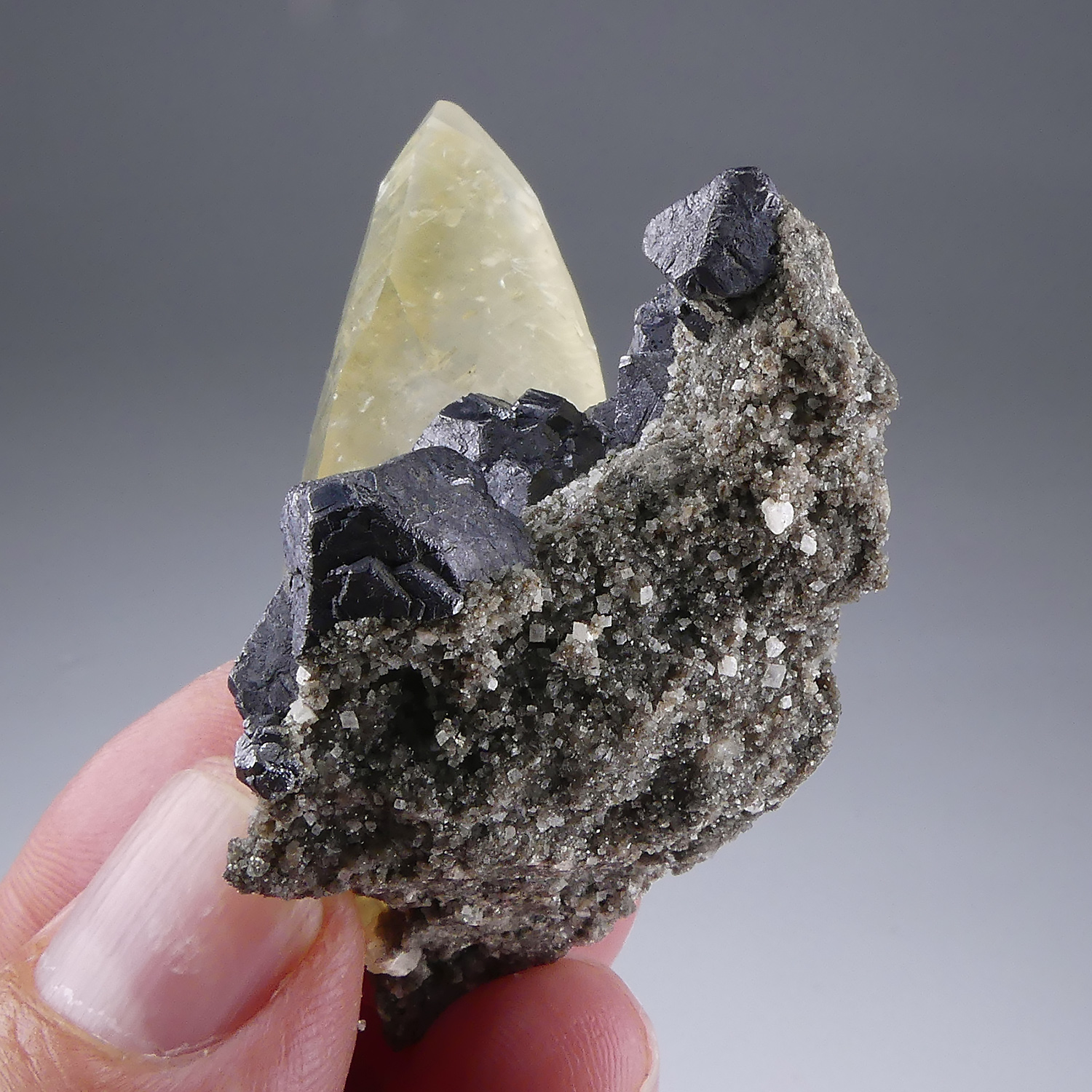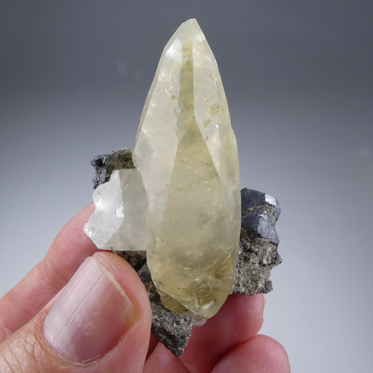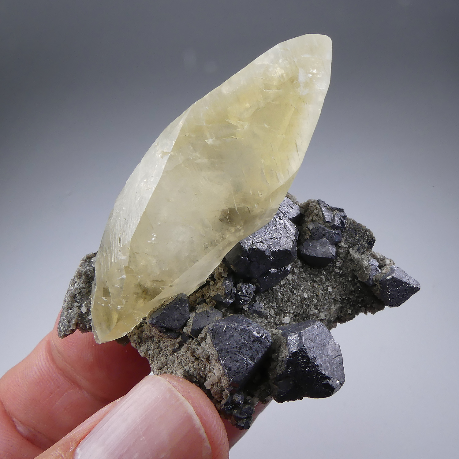 Calcite and Galena from Joplin Field, Jasper Co., Missouri, USA – very nice specimen of double terminated Calcite crystal with transparent to translucent aspect and yellow color, perfectly perched on a matrix composed by octohedral galena crystals with greysch metallic luster – overall size 5,7×4,2×3 cm. – Calcite 5,2×1,7 cm.