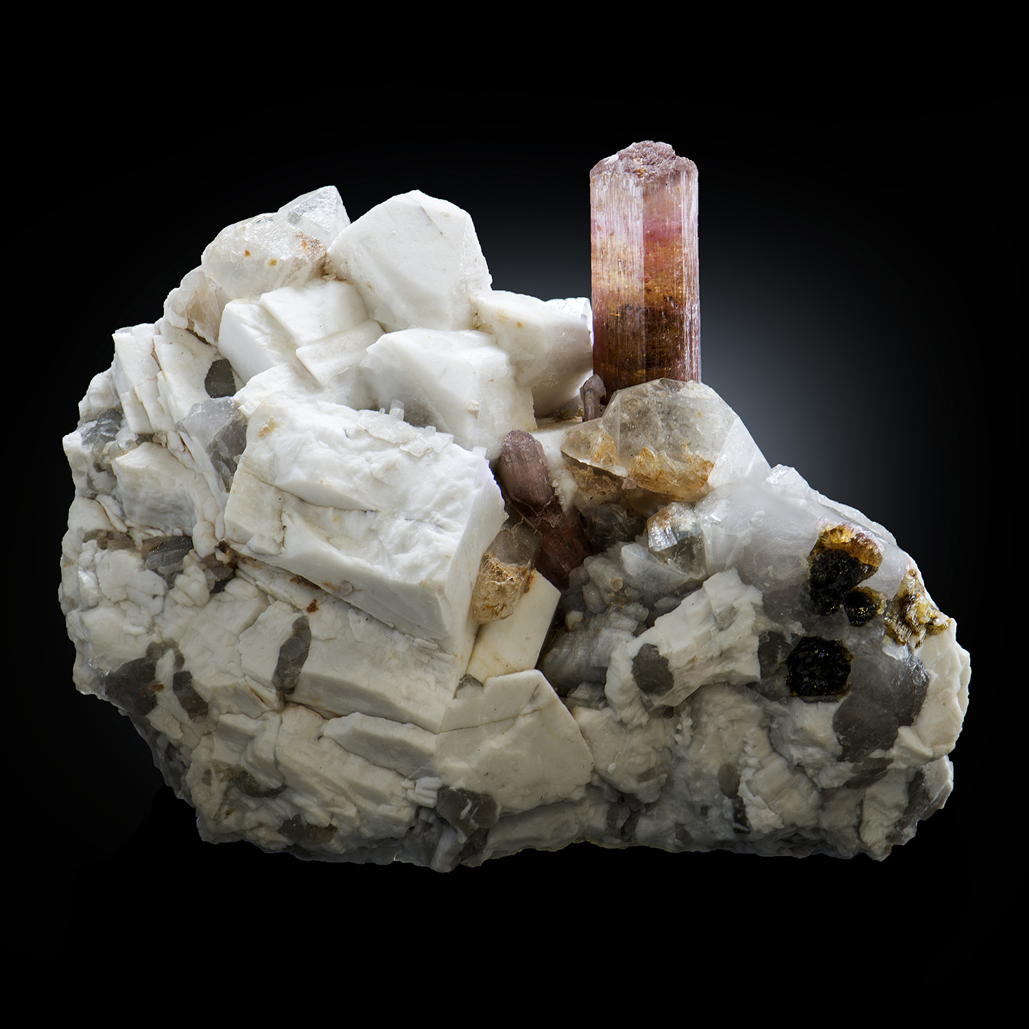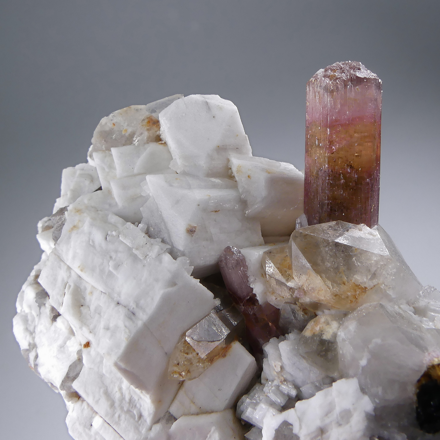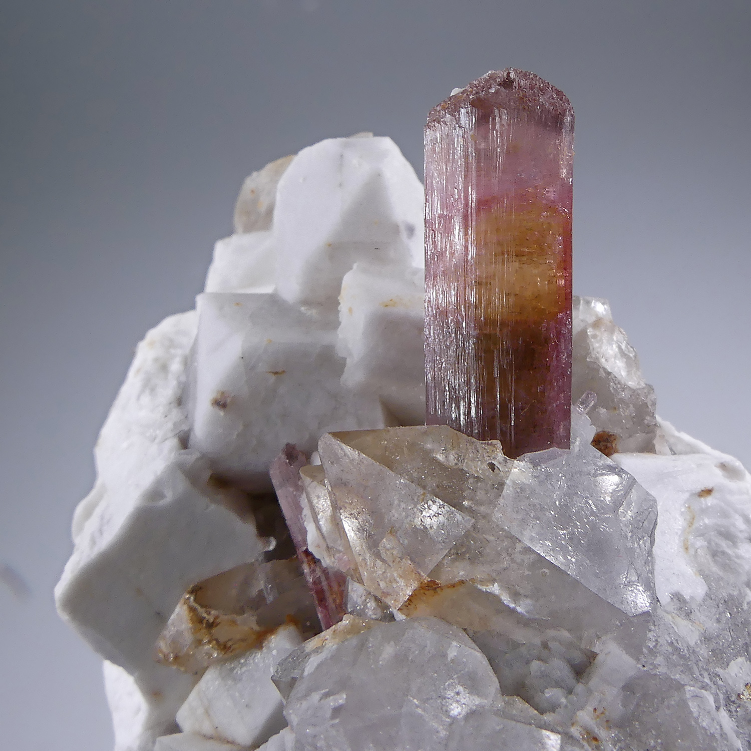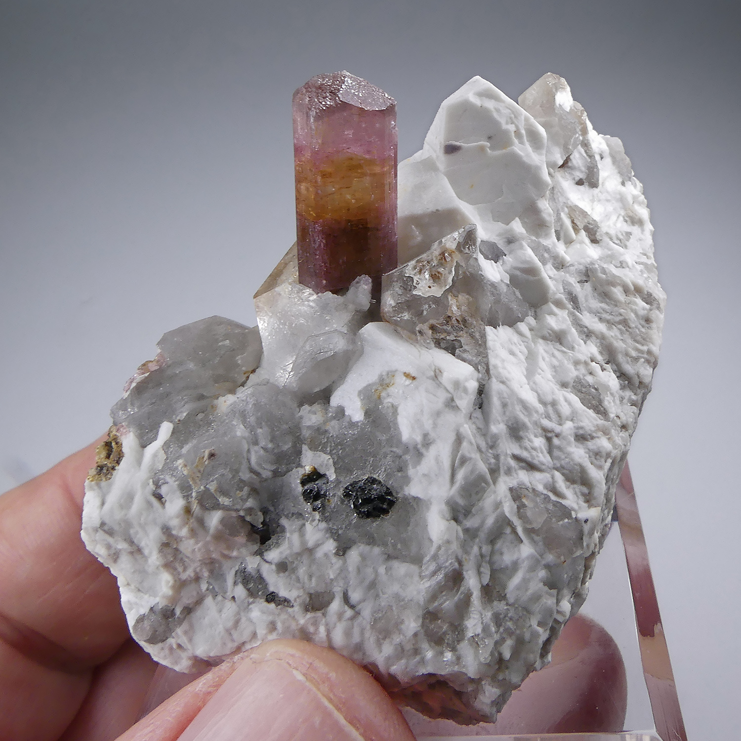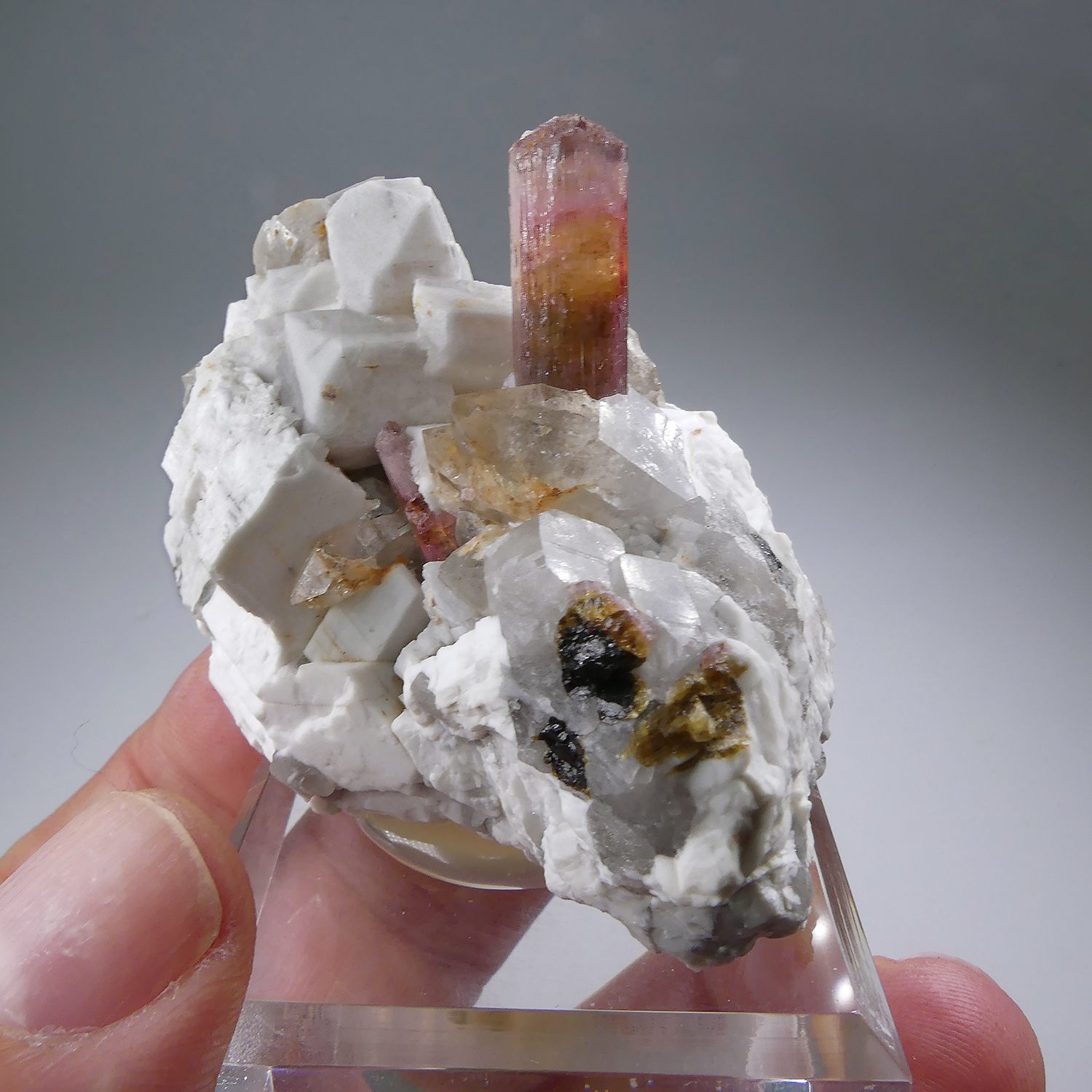 Elbaite from Beni Bouzra, Chefchaouen Province, Tanger-Tetouan-Al Hoceima Region, Morocco – the polycrome Elbaite crystal emerge from a matrix composed by quartz crystals and white feldspar group, it features good luster and transparency and show some color zoning from pink-red to yellow-brown – overall size 5,5×4,5×3,5 cm. – Tourmaline 1,7×0,7 cm. – acrylic base included.