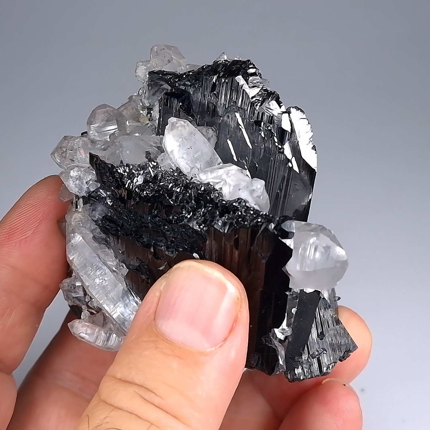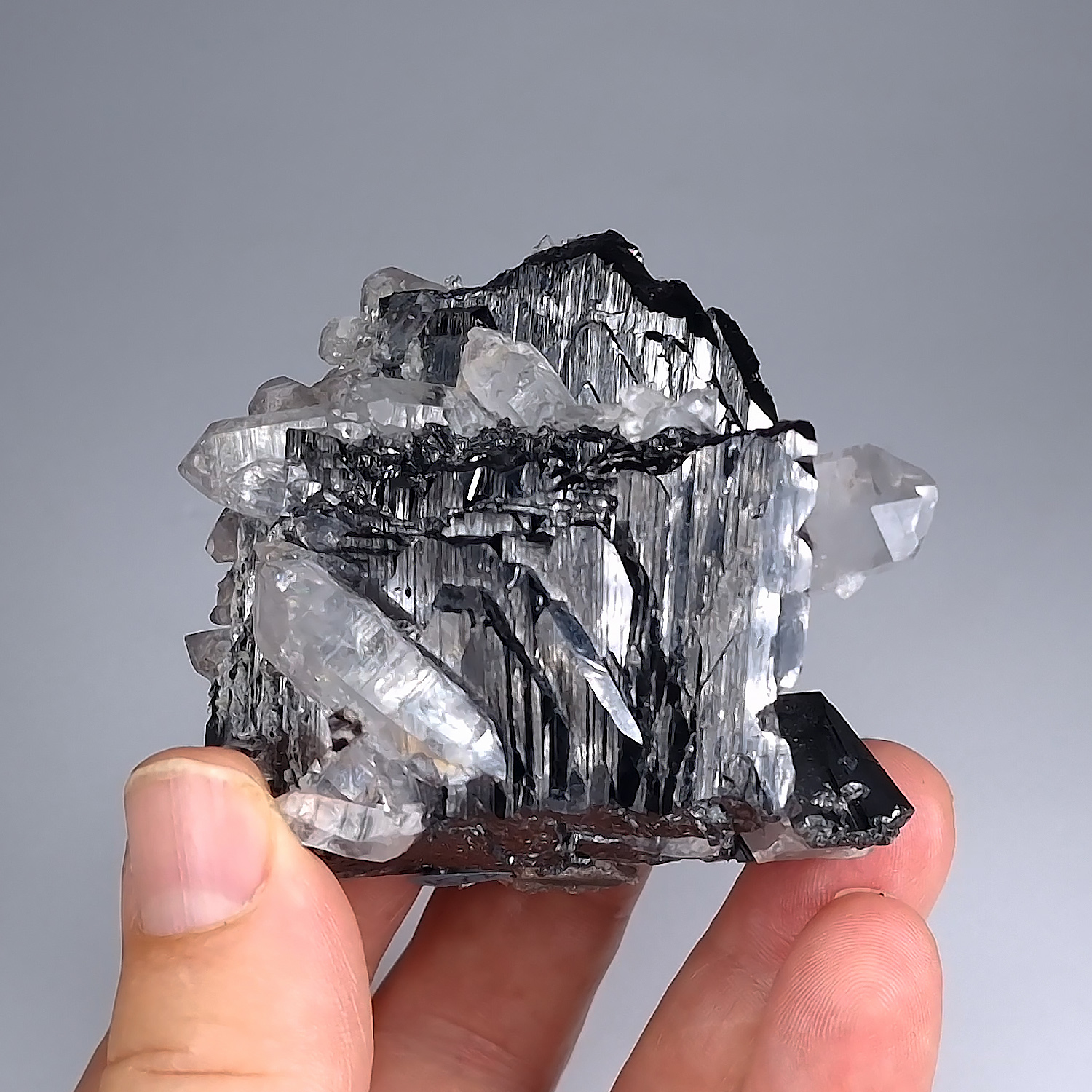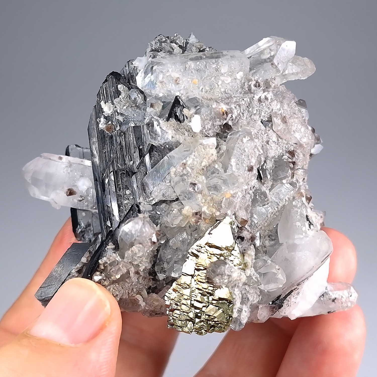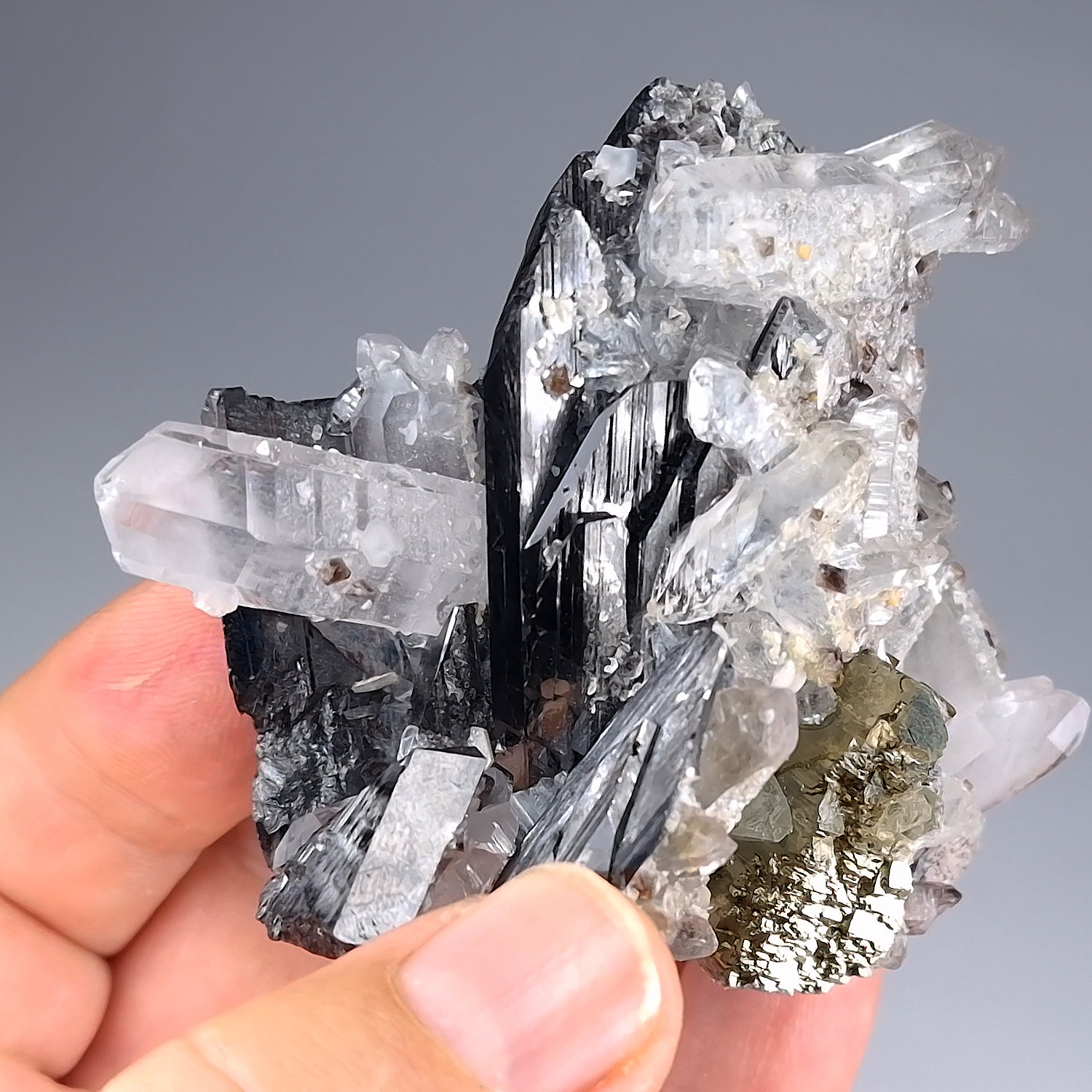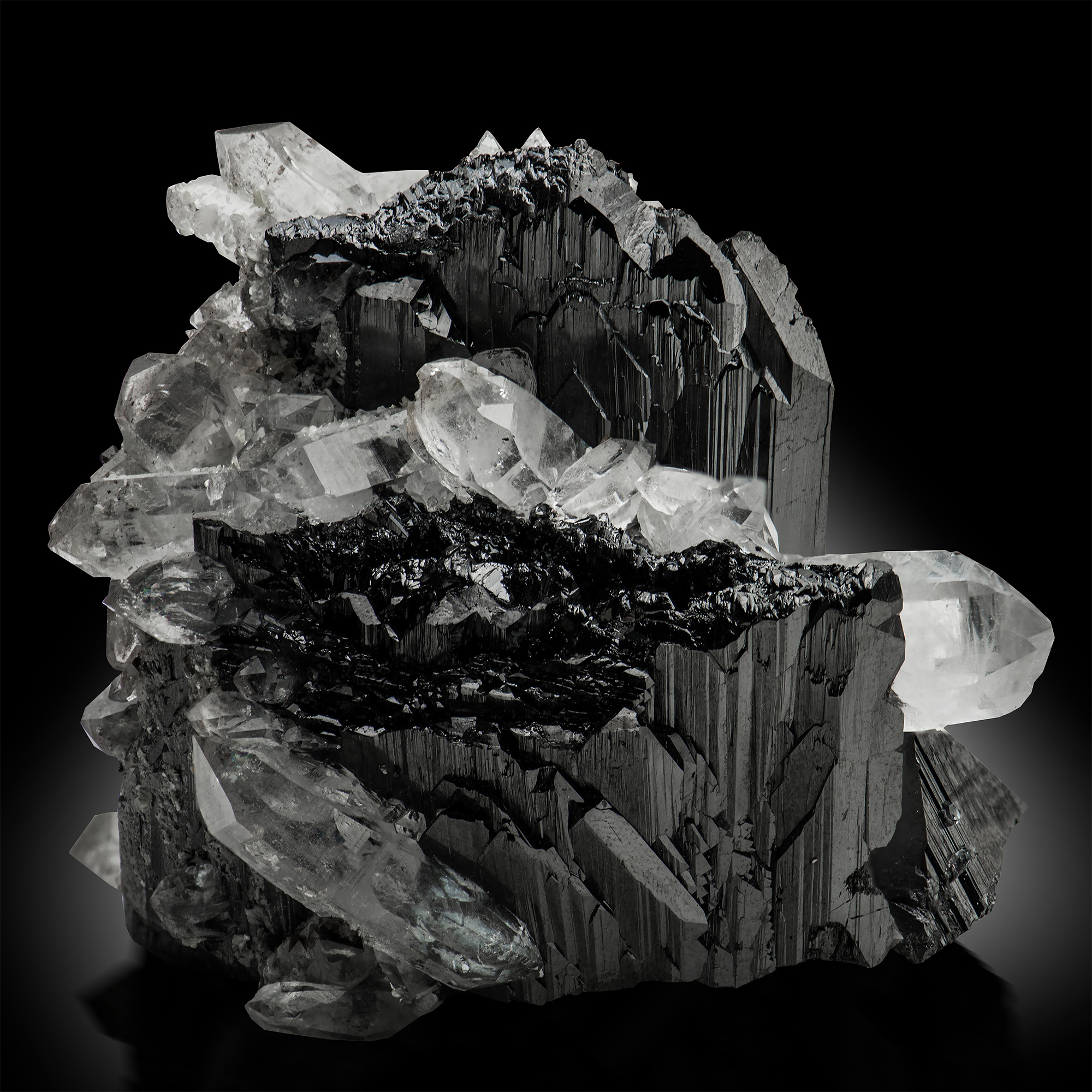 Wonderful display all around for this incredible combo showing a perfect color contrast between Quartz and lustrous black Hubnerite with a bi-terminated quartz crystal just placed in front; on the back, here and there, small brown octahedral Scheelite crystals and a stepped gold Pyrite complete the beauty of this specimen.