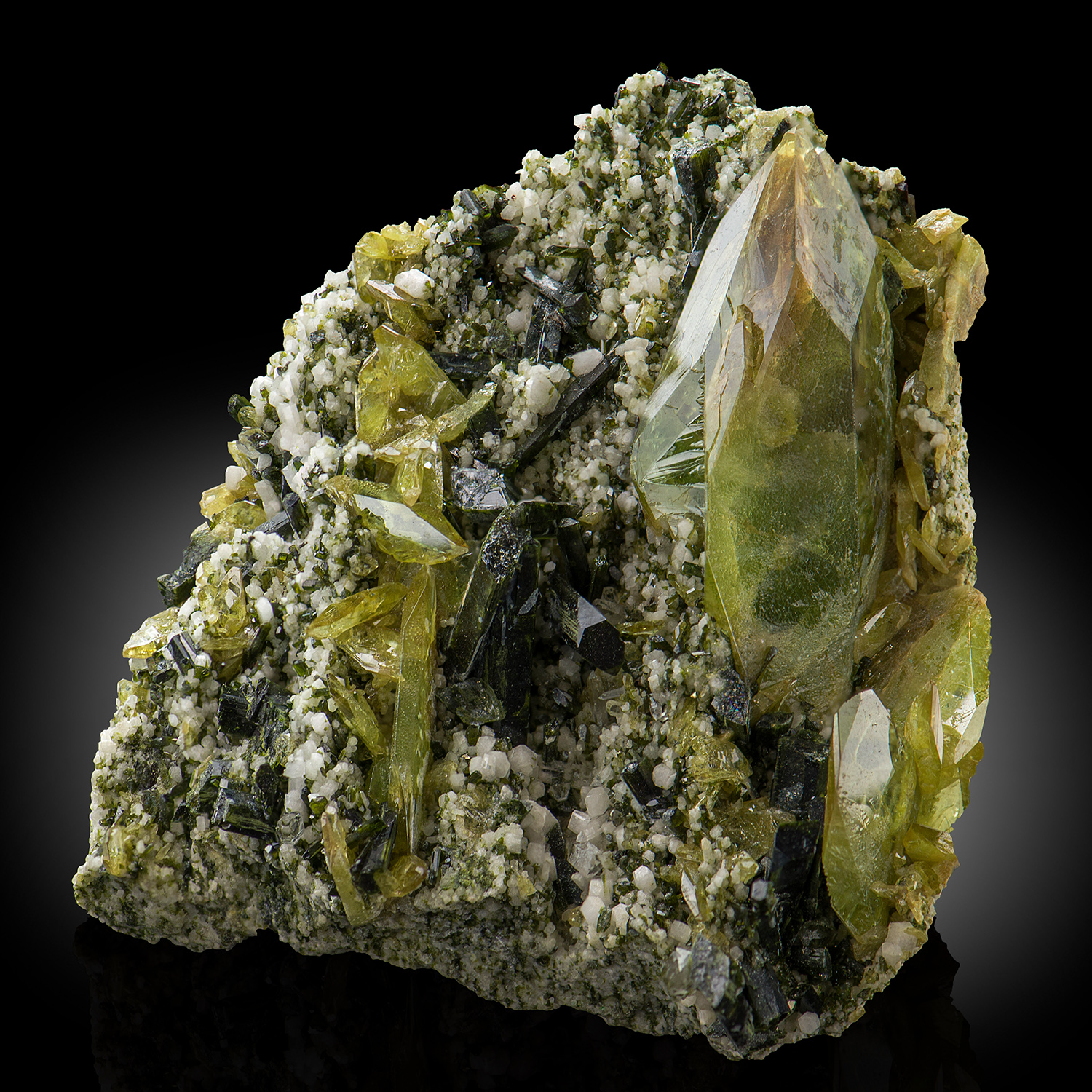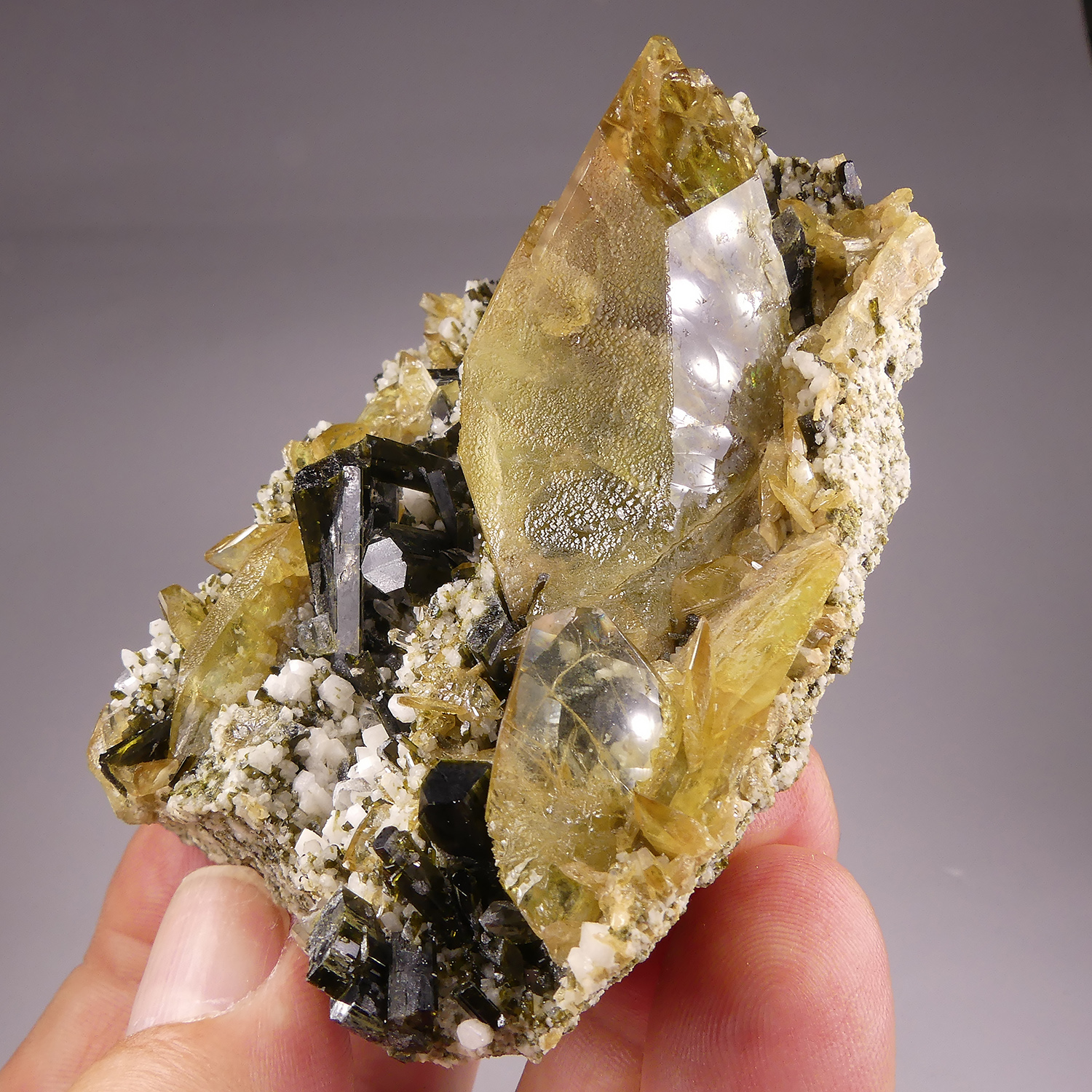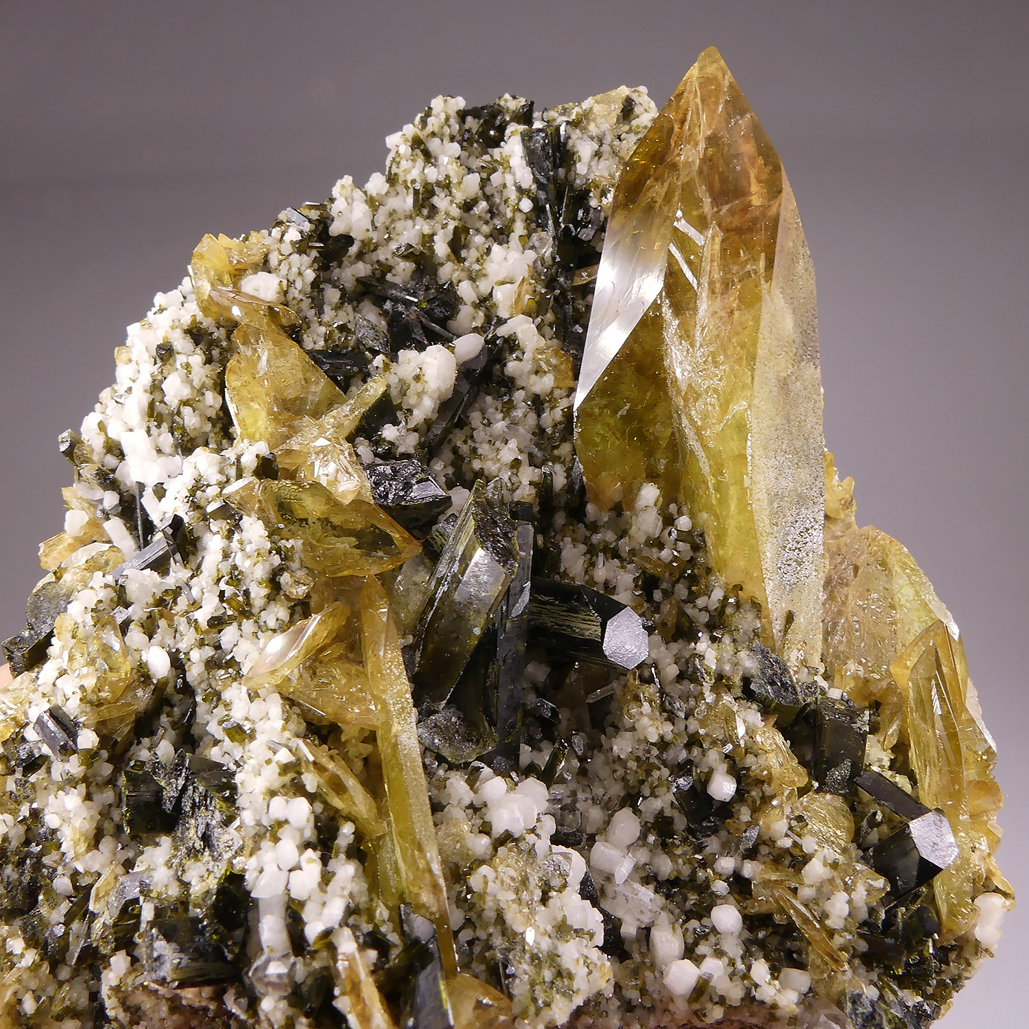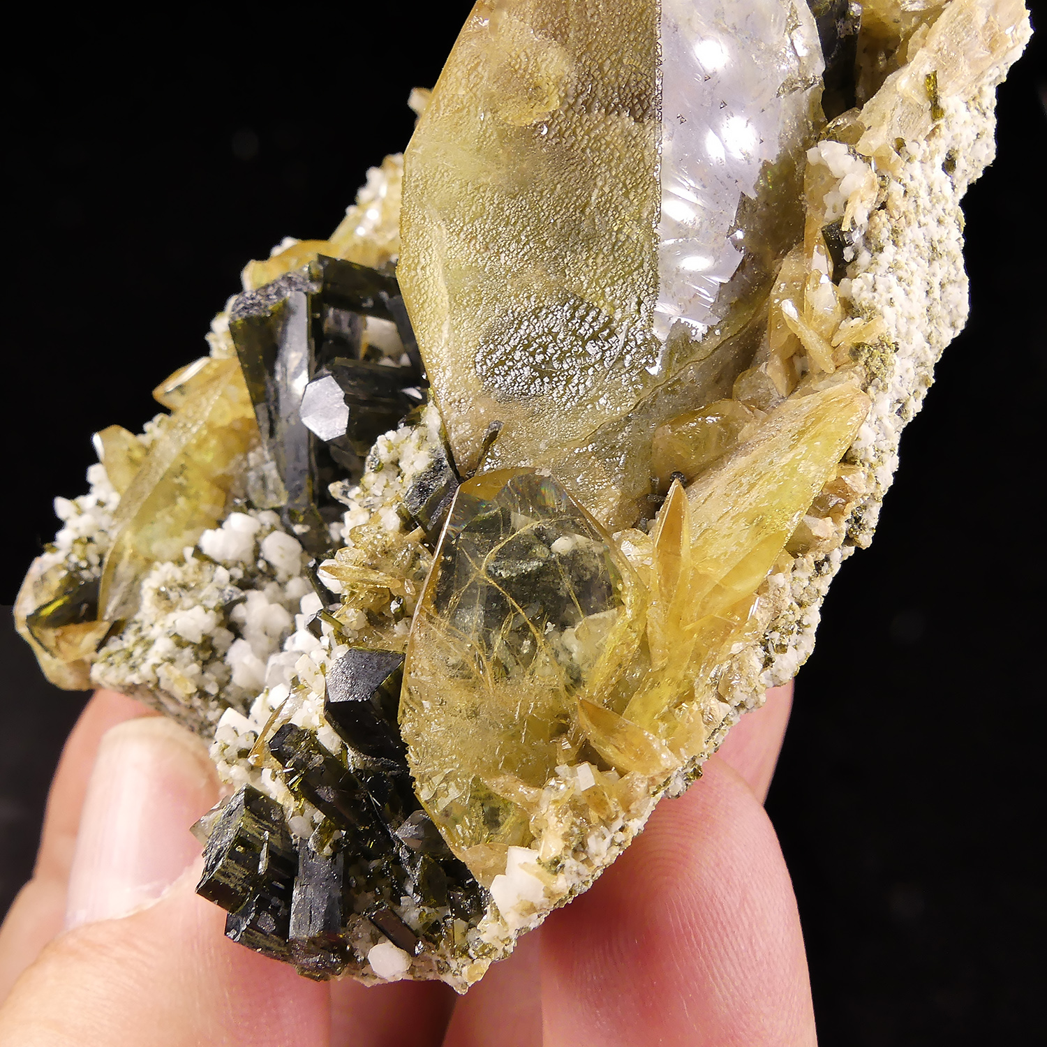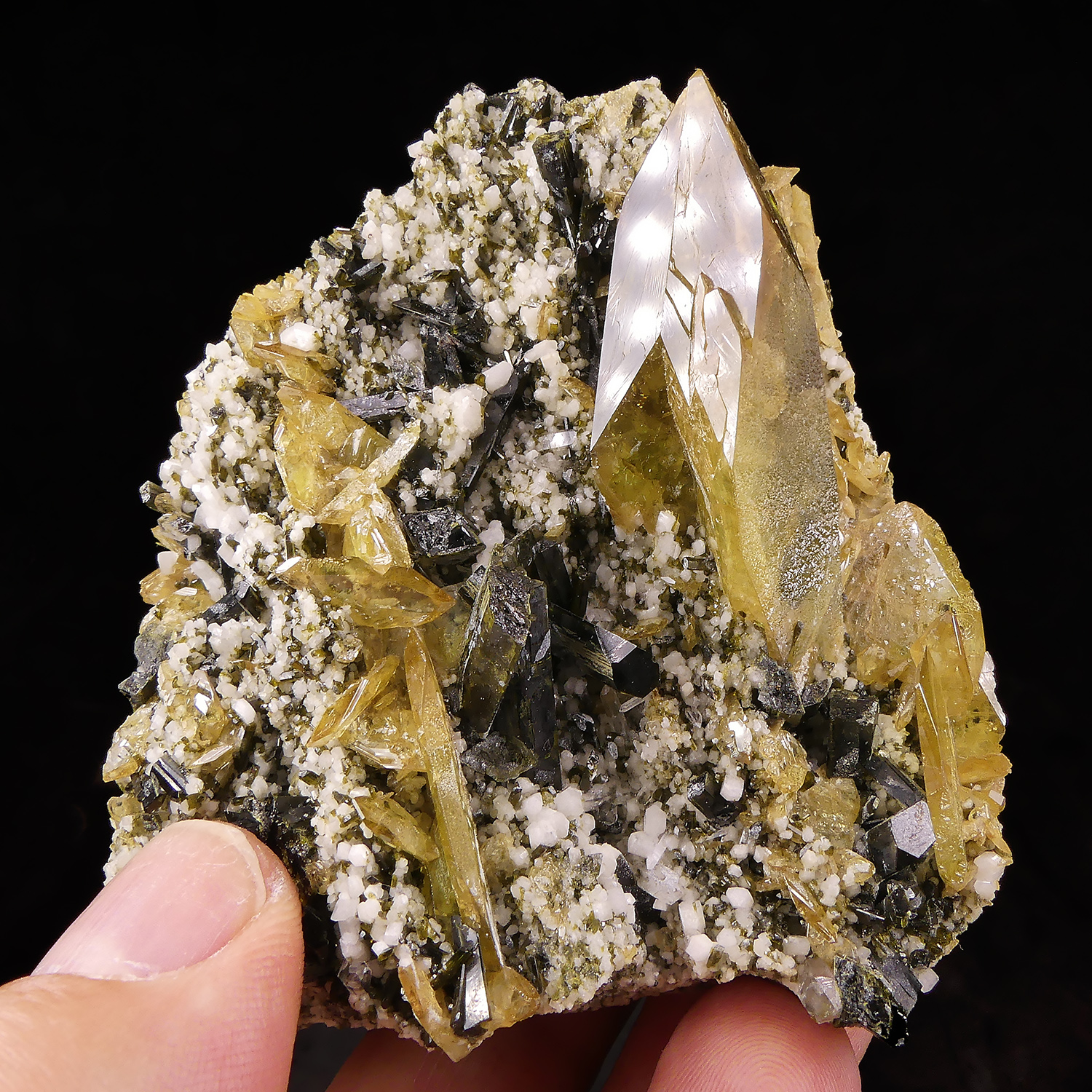 Sharp, gorgeous, sparkling Titanite crystals in association with brilliant dark green Epidote crystals; the matrix is covered by many Titanite crystals that have greenish yellow nuances to brown color with transparent to translucent aspect, the longer one stands out beautifully with its 4,4 cm.; It is very uncommon to find a titanite of this quality and size and this beautiful specimen is completed by white small Albite crystals for a wonderful color contrasting effect.