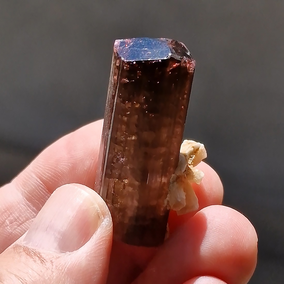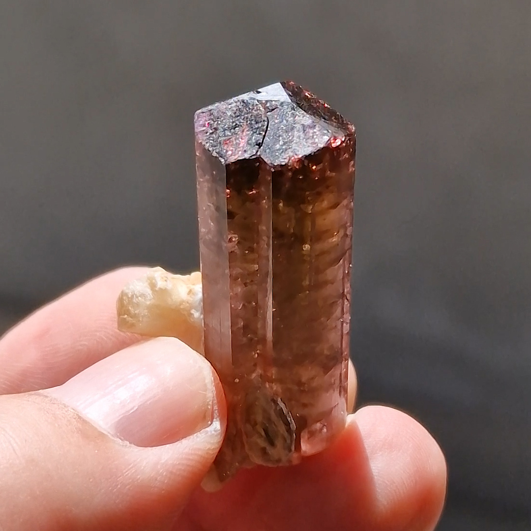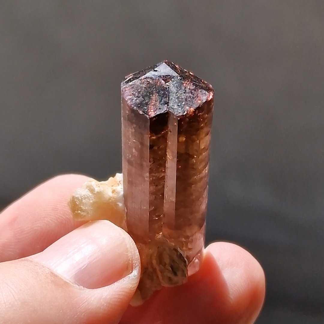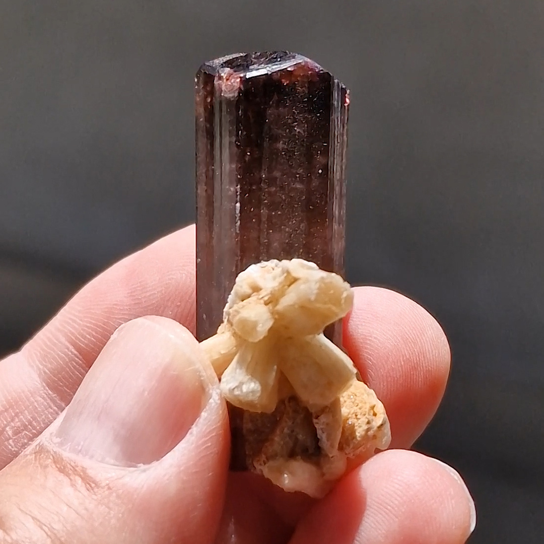 This Elbaite crystal is complete all around and displays lustrous prism faces that exhibit light striations parallel to their length with two sharp, glassy terminations. Translucent to transparent structure, it reveal in general a pink-magenta color classic for this locale, with the top more intensly magenta. Termination below is very interesting because it shows areas of different intensities, more magenta in the core. Elbaite is associated and completed by the presence of a well crystallized light yellow Stilbite cluster. The overall quality of this specimen hardly comes from this classic Russian locality, and for this reason this piece can be considered an excellent and rare example. Custom base included.